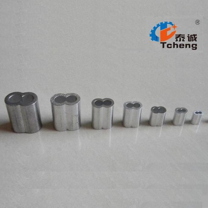 鋼絲繩鋁套—鋁套是鋁材質(zhì)的,較輕,用來固定鋼絲繩兩端的頭的,鋼絲繩根據(jù)需要的掛圈大小,插入鋁套,然后放入壓套機(jī)模具內(nèi),(根據(jù)鋁套型號對應(yīng)壓套機(jī)模具,模具型號跟鋁套型號都是標(biāo)準(zhǔn)尺寸),壓制完,把兩邊擠壓出來的鋁廢料清理掉,一根鋼絲繩完成!